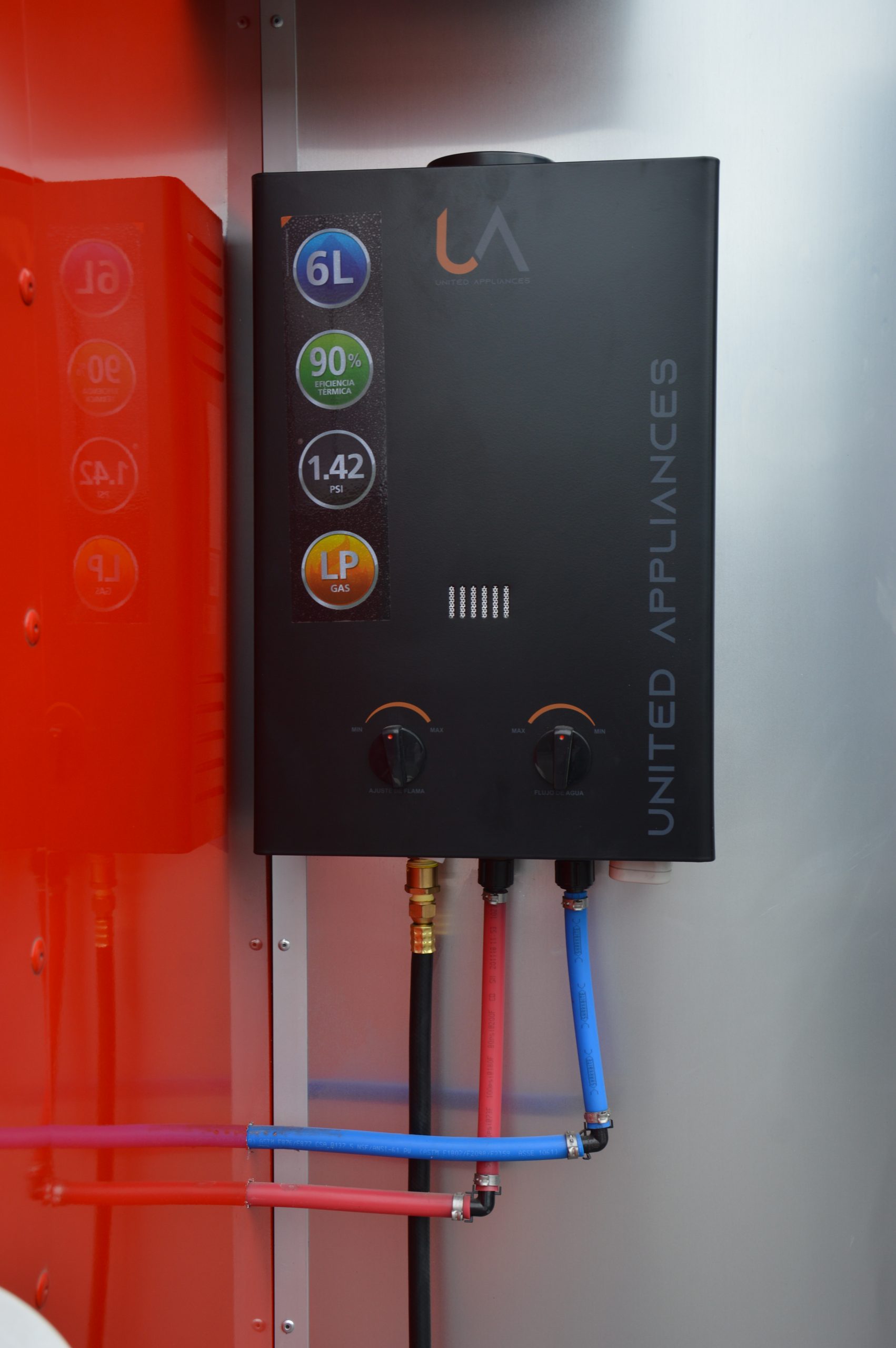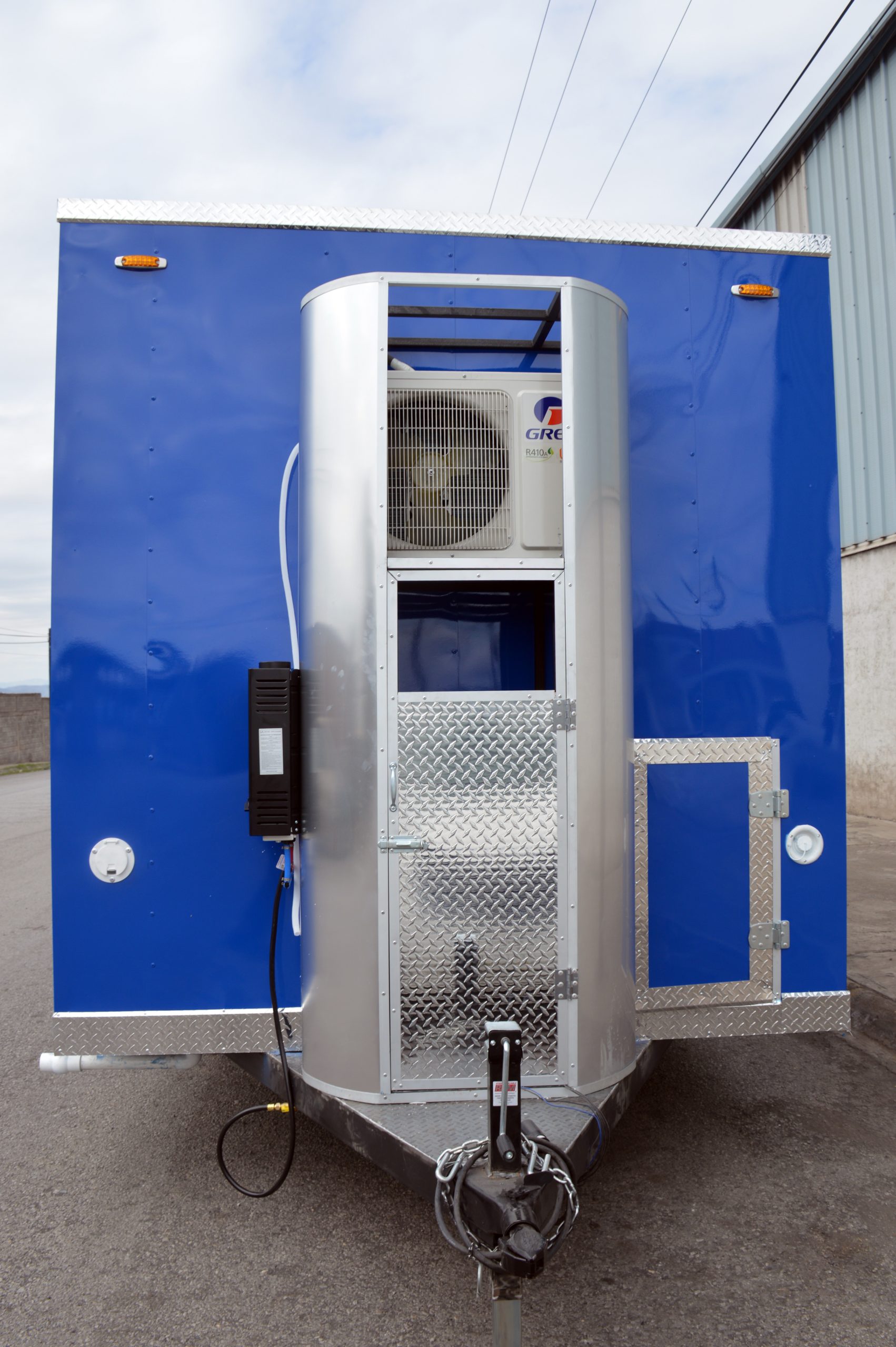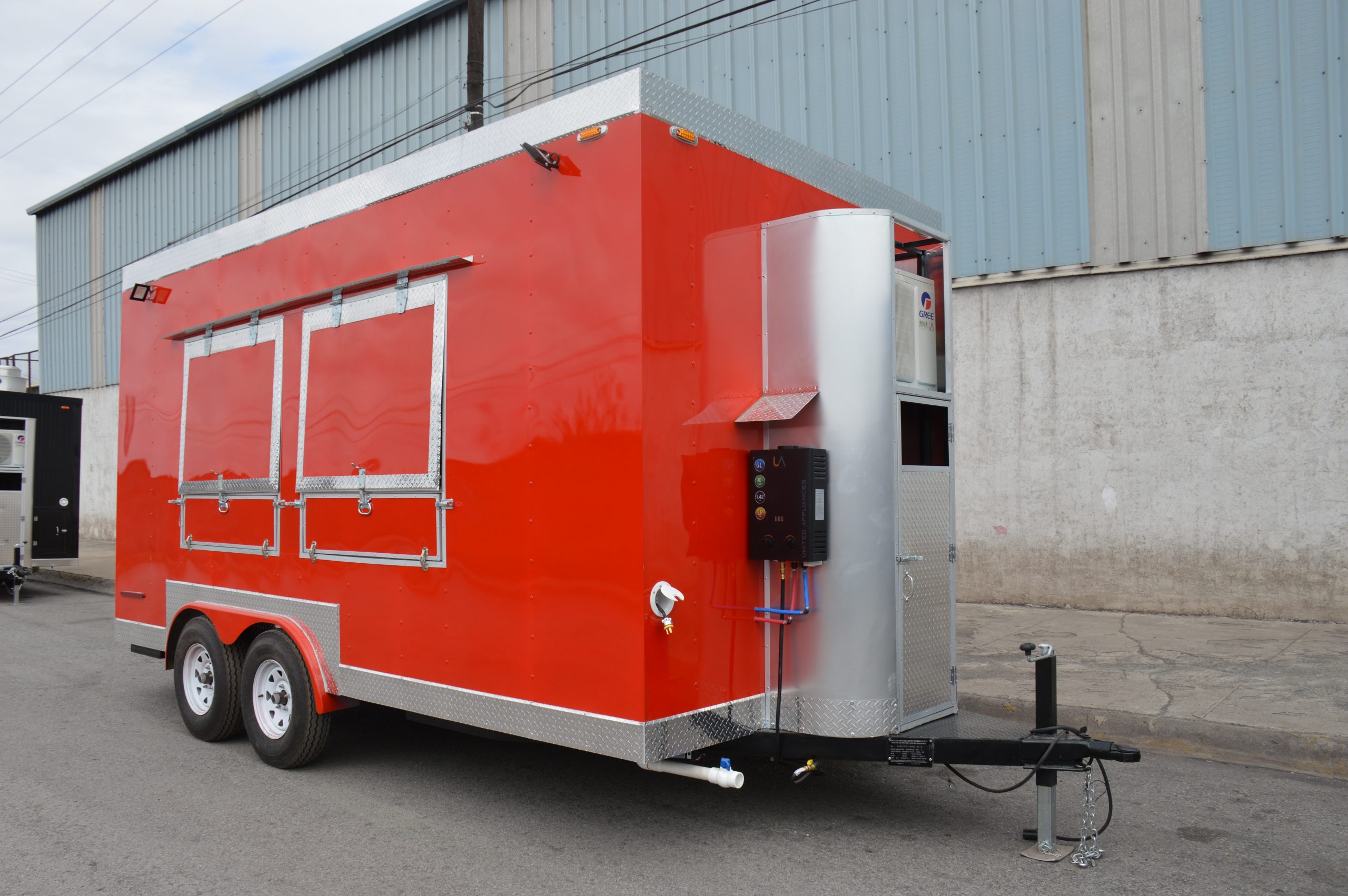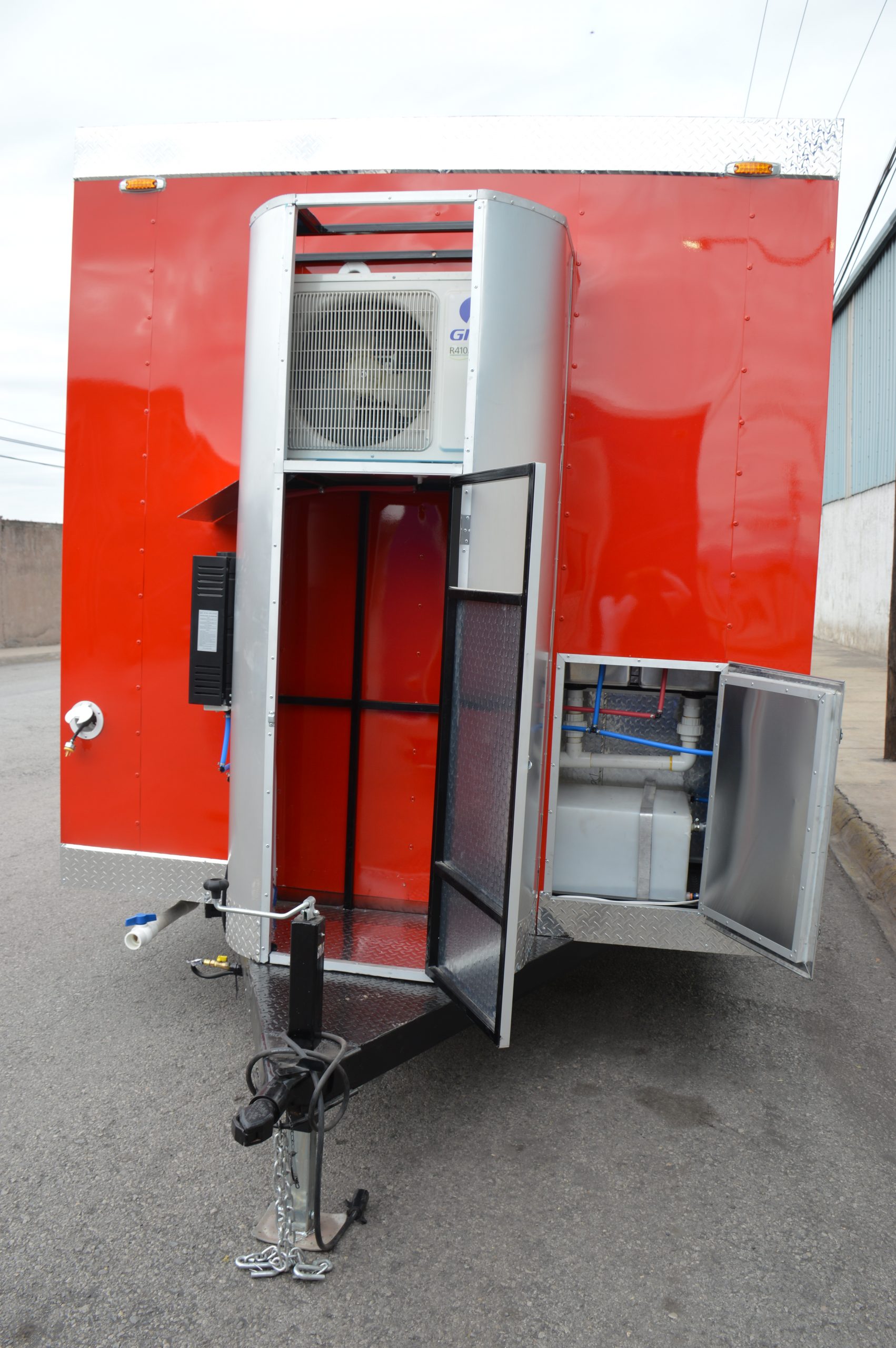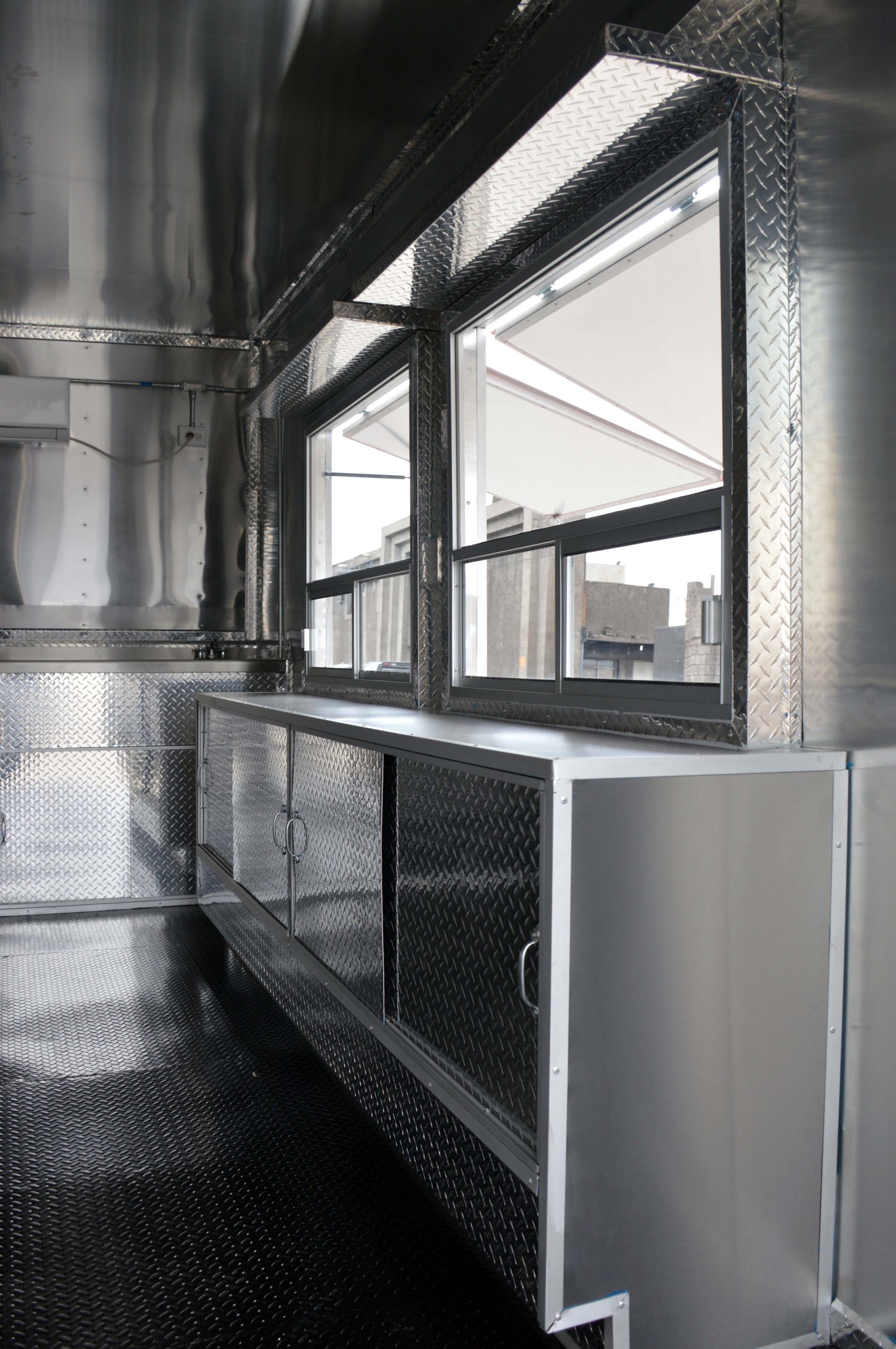 Manufactured with a metallic structure and 1” thick thermal insulation. Walls and ceiling of cal. 24 riveted pintro sheet; Cal. 14 thickness steel plate floor, stainless steel covered interior wall at the equipment and sink area. 1 1/2" aluminum window with 3 mm clear glass, braking system on both axles, emergency brake, reinforced ball type hitch, led lights, 110 volts electrical installation with exposed conduit pipe, automotive exterior paint.